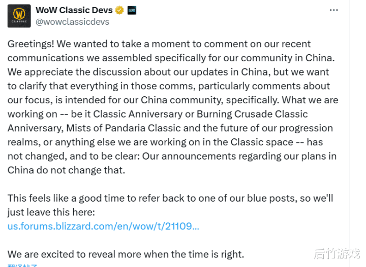 “大家好!我们想花点时间评论一下最近专门为中国社区发布的公告。感谢大家对我们在国区更新的讨论,但需澄清的是,这些公告的所有内容,尤其是关于我们工作重点的评论,都是专门针对中国社区的。我们正在进行的开发,无论是经典怀旧服周年纪念版、燃烧远征经典怀旧服周年纪念版、熊猫人之谜经典怀旧服以及我们未来服务器的开发,还是我们在经典怀旧服领域正在开发的任何其他内容,都没有改变。需要明确的是:这个中国计划的公告不会改变这一点。”