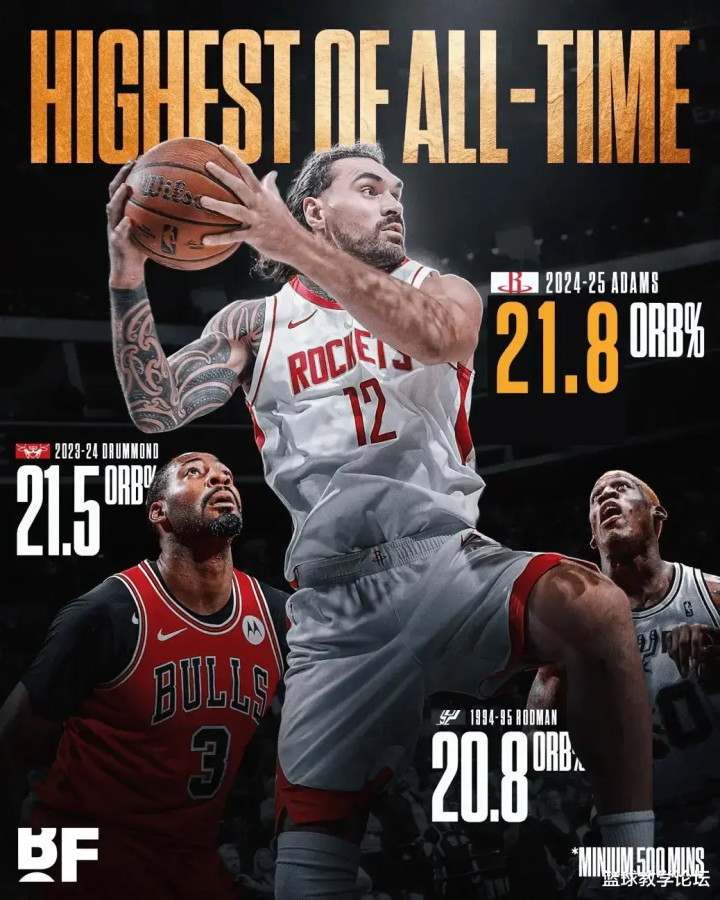 在亚当斯的带动下,本赛季火箭全队场均48.9个篮板球,高居联盟第一,领先第二的灰熊2.3个;场均16.4个前场篮板,同样是联盟第一,领先第二的开拓者1.9个。今年休赛期,火箭3年3900万美元续约亚当斯,本赛季薪水1413万。