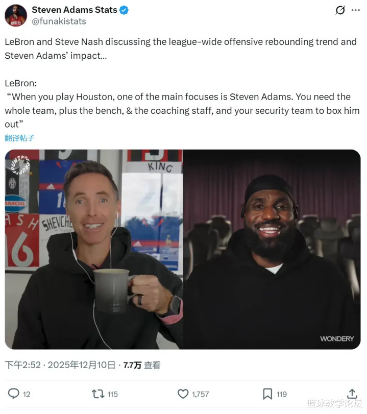 2024-25赛季,亚当斯前场篮板率为21.8%,超越德拉蒙德(21.5%)和罗德曼(20.8%),位列NBA历史第一。今年休赛期有一项针对NBA球员的匿名调查:你最不愿意跟谁打架?詹姆斯-约翰逊第一,斯图尔特第二,亚当斯第三。