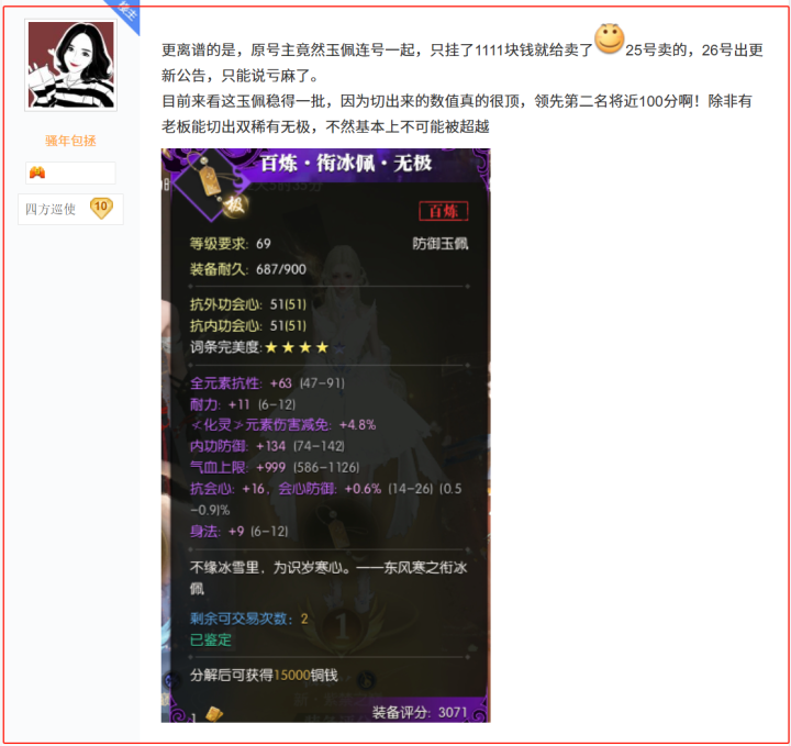 此前的60级玉佩上线时,就催生出了很多“都市传说”。比如有大佬为了获得更多的玉佩胚子进行鉴定,用1000万一块的价格扫空了市面上的所有极品玉佩胚子;还有玩家随手鉴定了个绑定玉佩,竟然鉴定出了服务器第一的防御向玉佩,转手就卖出几千块的价格,而买他号的玩家,更是运气爆棚的赶上“江湖神兵谱”活动,凭借这块极品玉佩榜上有名,获得了数万元的官方奖励。