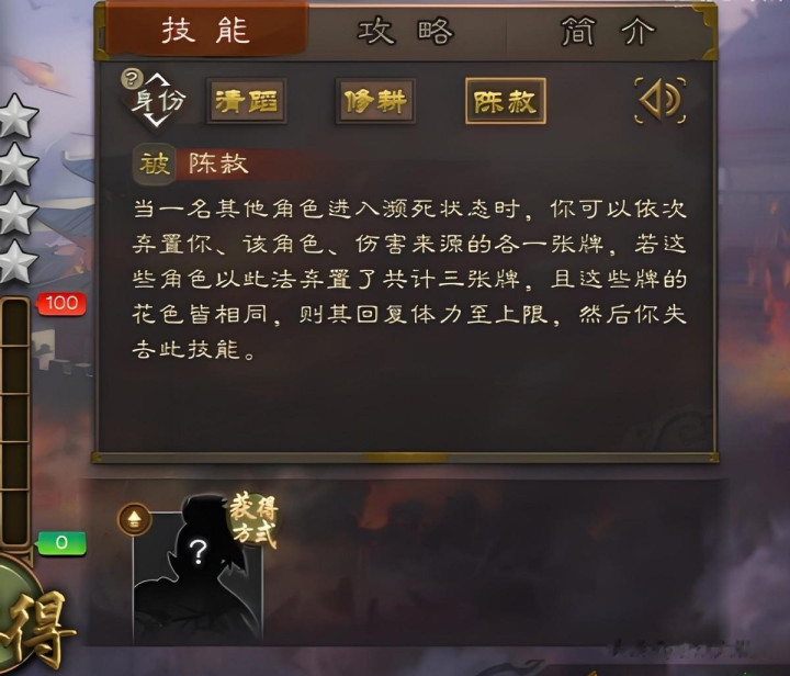 在危急的时刻,【势国渊】的【陈赦】相当于是给队友的“复活甲”,可以救人一命。对应的是当时田银、苏伯造反失败,数千跟随造反的人兵败后请求投降。国渊认为跟随造反的人不属于首恶,向曹操求情,使得这一千余人都得以保命。