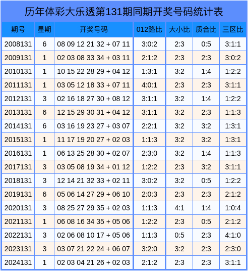 其中前区的012路比为1:3:1,三区比为3:1:1,大小比为2:3、质合比为3:2。