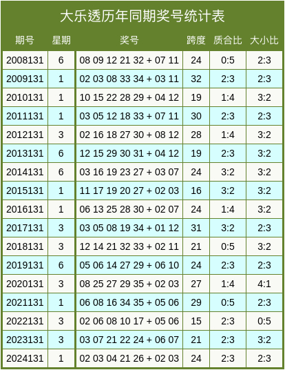 大乐透历年同期奖号数据统计图表