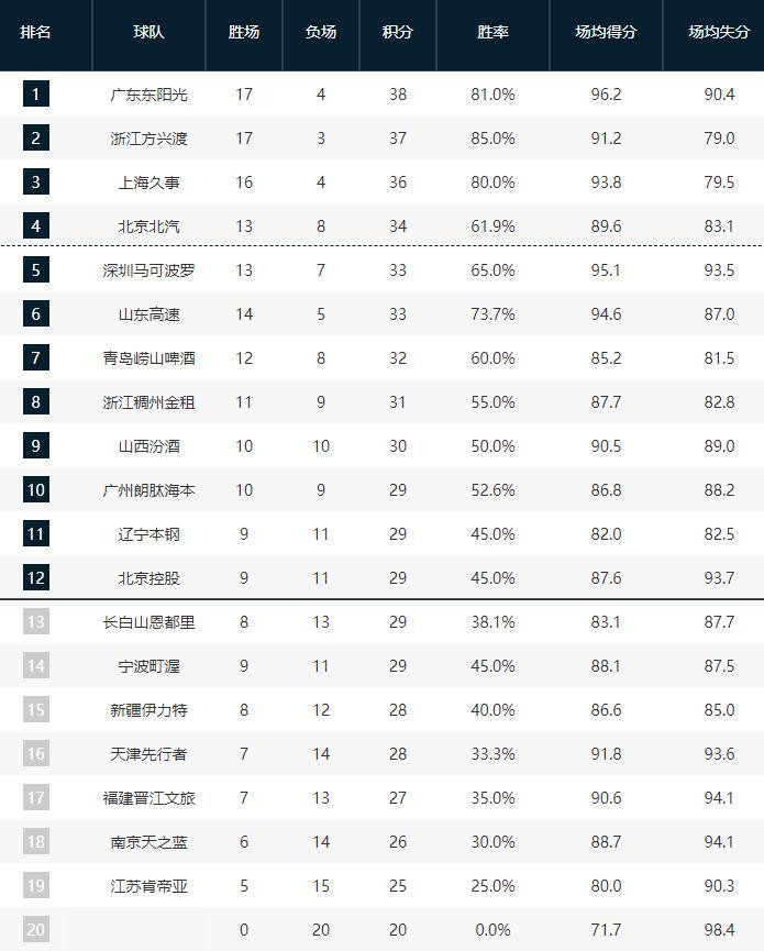 截止本个比赛日,CBA常规赛积分榜如下,广东队五连胜,先赛一场又回榜首。