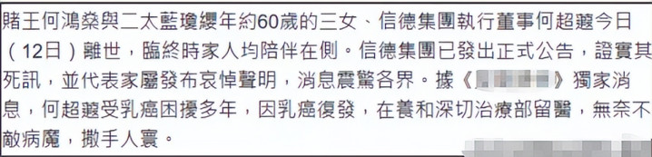 2026年4月12日,赌王何鸿燊家族传出令人惋惜的消息,二房千金何超蕸因病离世,港媒后续披露,何超蕸长期受乳腺癌困扰,此次因病情复发抢救无效离开人世。