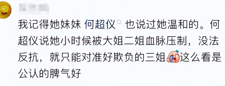 在何超仪眼里,何超蕸性子太软,脾气太好,几乎不会与人争执,是家里最好相处也最容易被忽略的存在,这样的评价从侧面印证了何超蕸温顺内敛的特质,也让大家看到她在家族里的温和姿态。