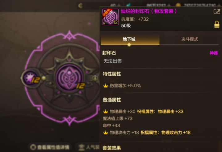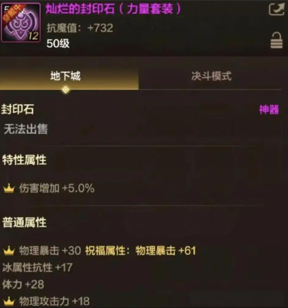 这游戏还有一个可以提升不少属性的装备可能被很多玩家所忽视了,就是这个封印石了。作为很多个版本之前的装备,这个特殊的装备其实也是能增加大量属性的。可能很多玩家随意的把这个封印石强化到12就不管了,毕竟强化12的封印石也能增加大量的抗魔值。而其实大家只要多刷新几次词条属性就很容易获得到这个“雷龙封印石”了。这个封印石的属性足足增加了91点物理暴击,还有5%的伤害加成和18点物理攻击力,这属性可是比狂暴雷龙还要强的。