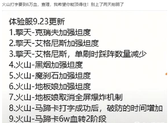 尤其是有玩家发现,23号体验服更新后安图恩团本的难度又上升了不少。这主要还是擎天和火山被加强了,擎天和火山的坦度被加强,也就是俗称的血量提升。虽然没有达到超级加倍的程度,但对于本来就伤害不够的团队来说更是雪上加霜了啊。
