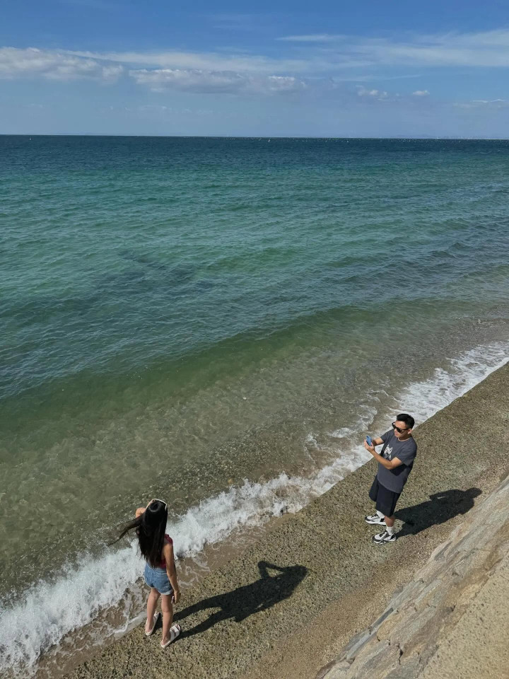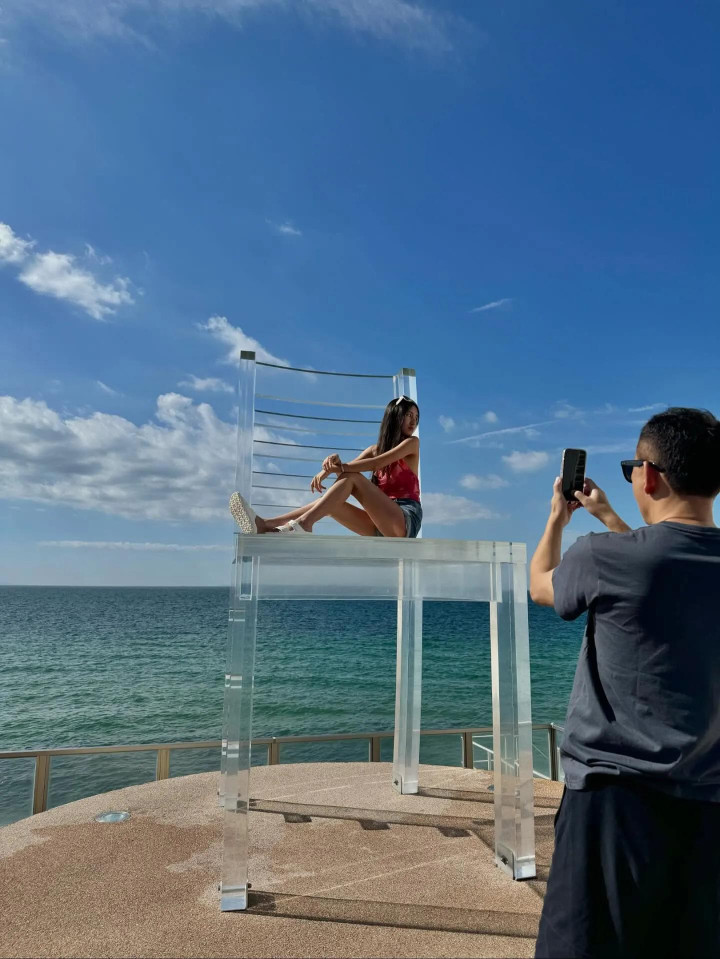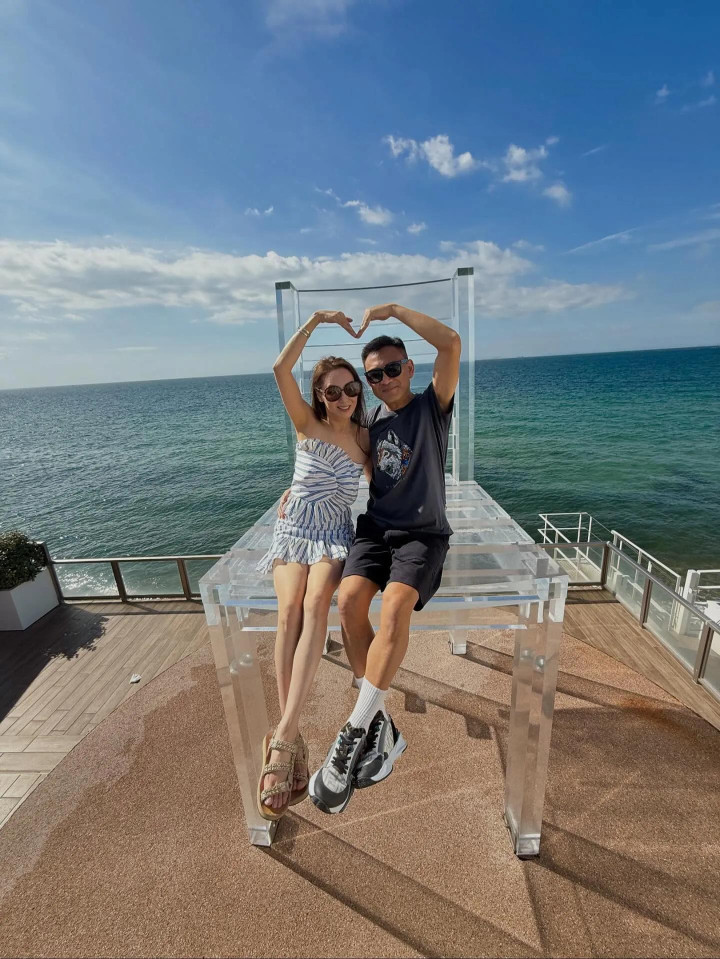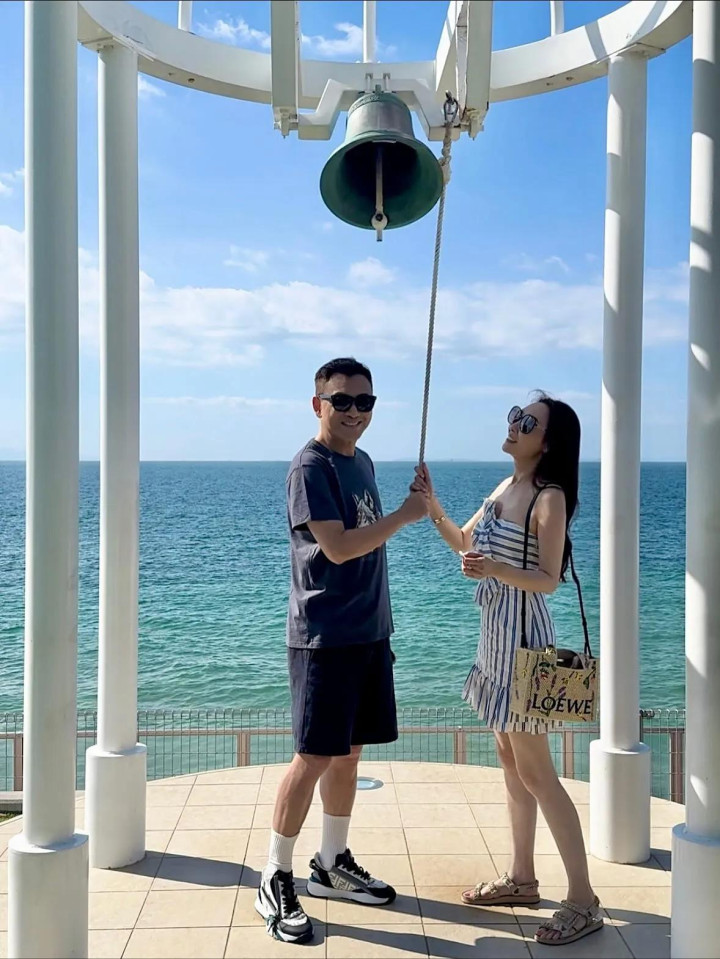 郭可盈和林文龙还坐在海边的透明大椅子上摆拍,林文龙搂着老婆,夫妇俩做出比心动作,看起来恩爱甜蜜。在女儿视角下的夫妇俩真的好登对养眼,二人笑容满面,看起来好幸福。
