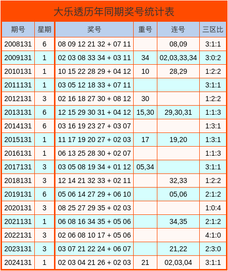 连号分析:在去年同期奖号中开出连号02,03,04,在历史同期中开出有连号的期数有10期,占比58.82%,本期预测开出连号24,25。
