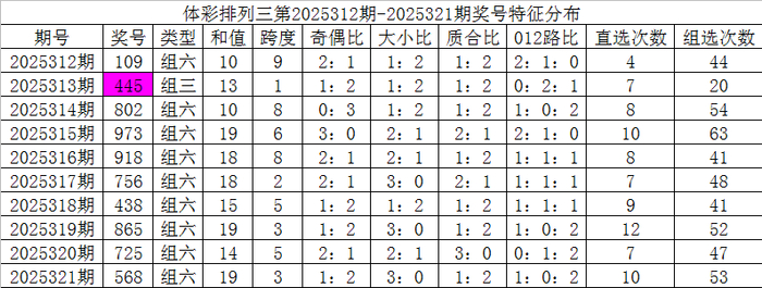 开奖公告:体彩排列三第2025321期开出奖号:568。组六,有重号:5,奇偶比1:2,大小比3:0,012比1:0:2,和值19,跨度3。