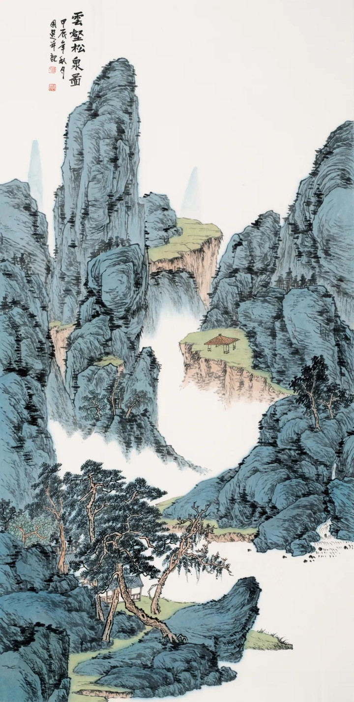 皴法简而意远,淡墨染云,浓墨锁崖,青绿点苔,如 “远看取其势,近看取其质”。亭之孤、山之雄、云之柔,成 “小天地” 之象。