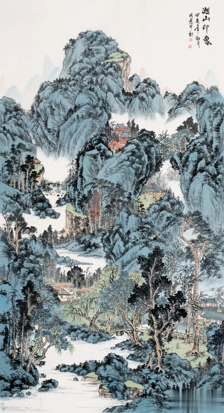 其法兼工带写:皴石用披麻兼斧劈,刚柔相济;点叶取夹叶、介字诸法,繁而不乱。设色淡赭笼山,花青润水,朱阁一点如丹,恰 “万绿丛中红一点,动人春色不须多”。